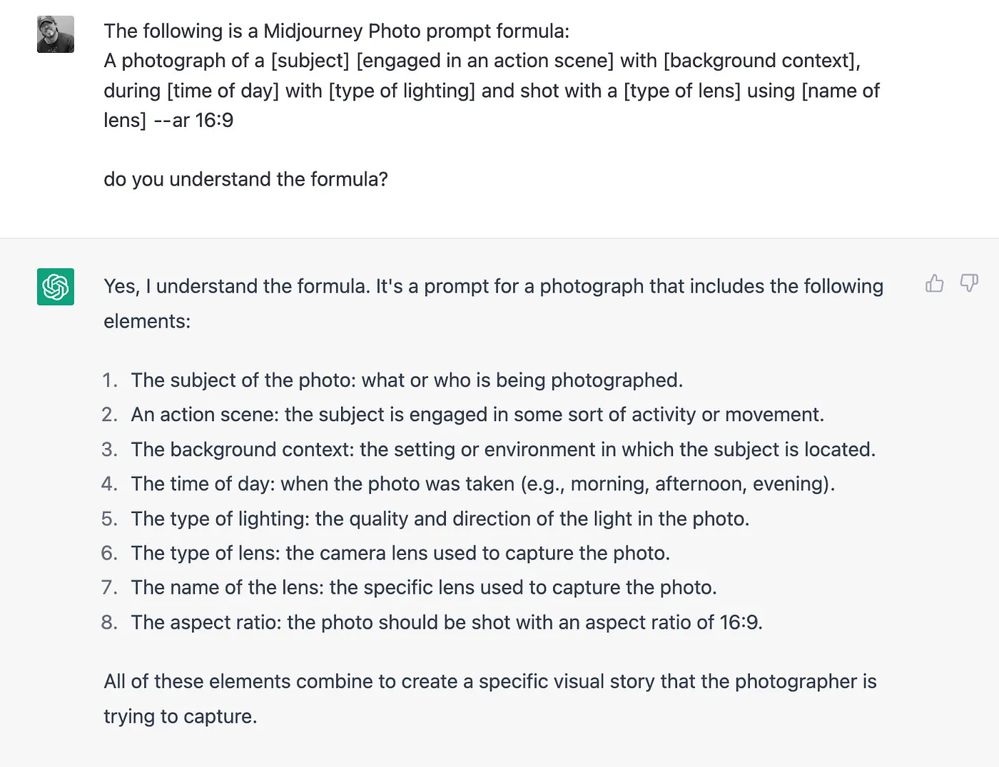 First, make sure chatGPT understands the ‘Midjourney Photo prompt formula’