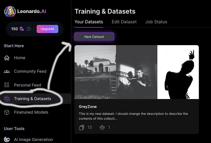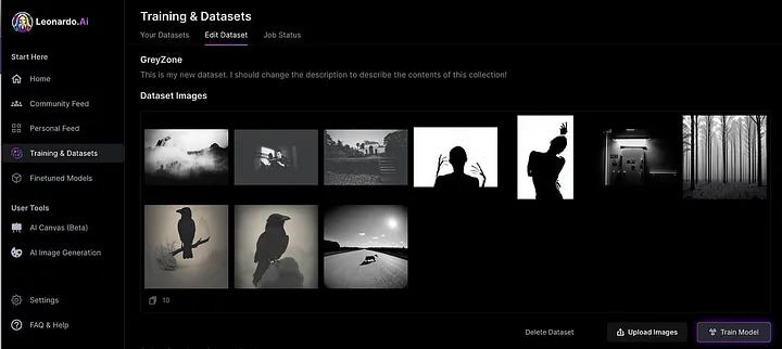 You start by creating a dataset, that consists of images you can either upload yourself or select from Leonardo’s gallery.