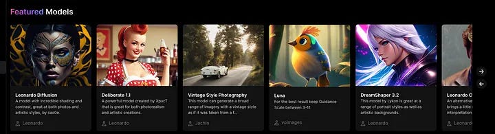 So the first thing you will notice when you login to Leonardo is a selection of featured models. The idea is to select one of the models that are closest to the style of images that you want to generate.